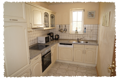 Küche mit Gefrierkombination, Herd und Geschirrspüler