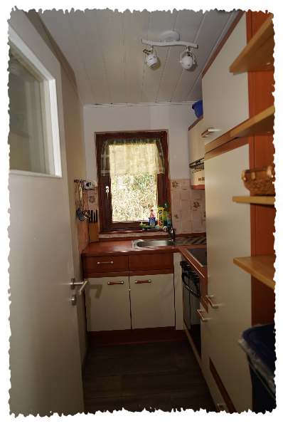 Küche mit Gefrierkombination, Herd und Spülmaschine